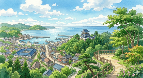 アニメ背景風で水彩寄りの街並み(自然と建造物が半々くらいのバランスで)。時間帯は昼で、高台から見下ろし気味のアングル。天気は晴れで3割ほど雲が流れている。